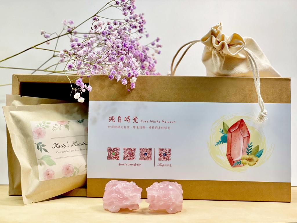 - 純白時光禮盒:包含了一位粉晶龍龜和兩個玫瑰手工皂。玫瑰香皂代表著純潔和愛情的芬芳,而粉晶龍龜則象徵著愛情的吸引力和和諧。
